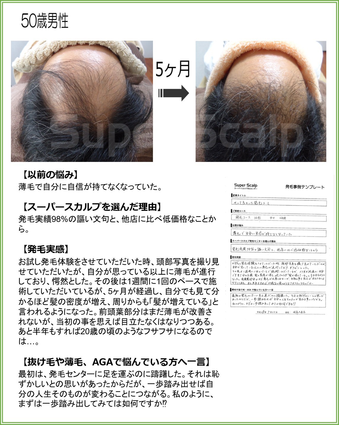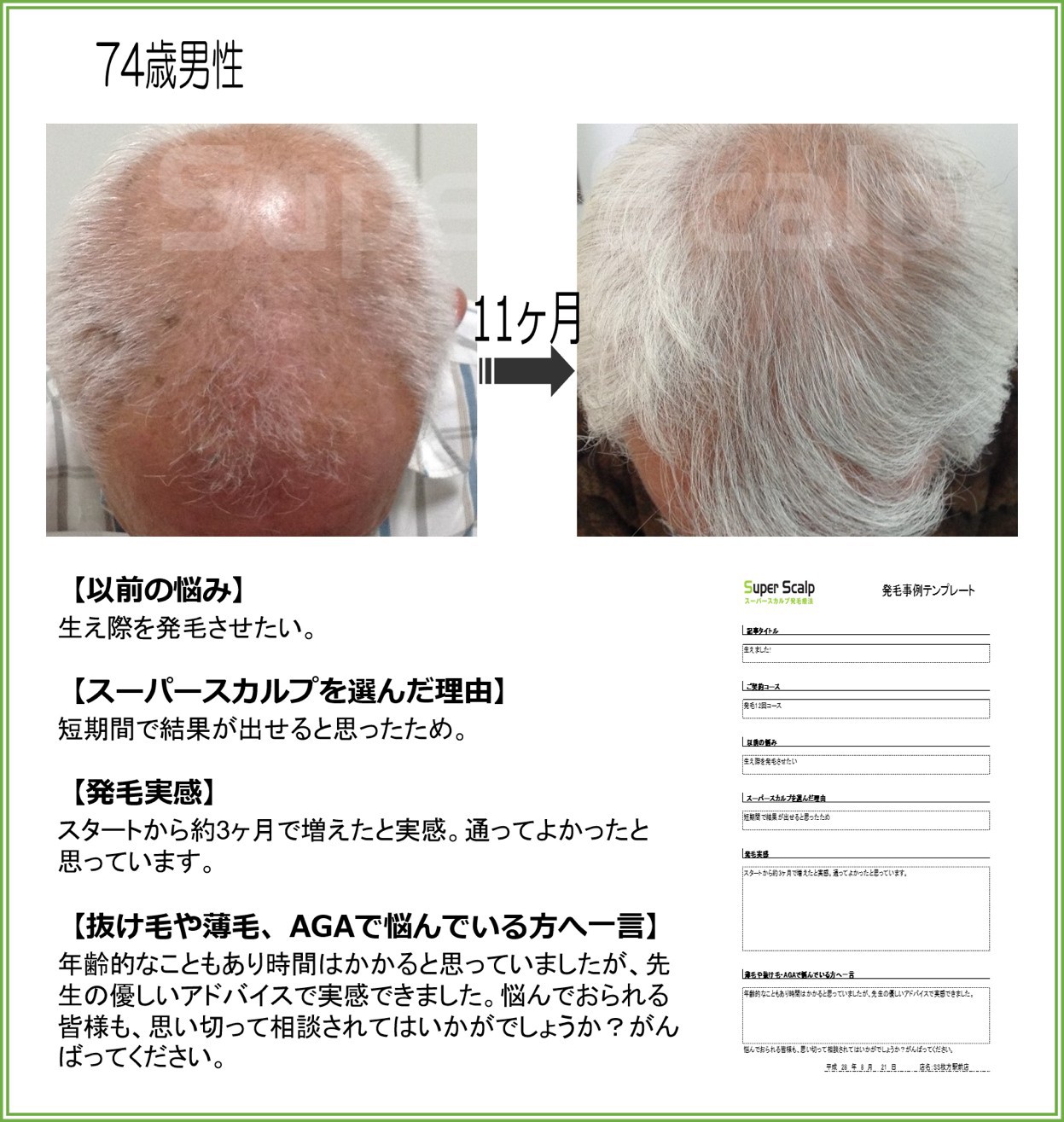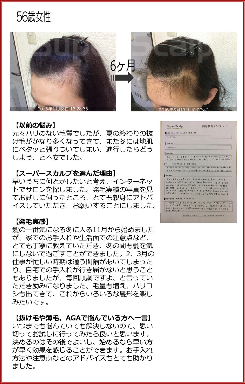 | 50歳 男性 5か月 5か月間で回りも髪の毛が増えたことに気づいてくれてます。 | | 74歳 男性 11か月 年齢もありあきらめていました。約3か月で効果を実感。 | | 56歳 女性 6か月 ハリのない髪質でした。家での注意点等のアドバイスも効果的でした。 |
